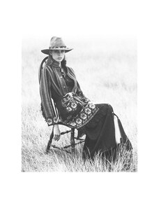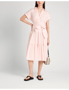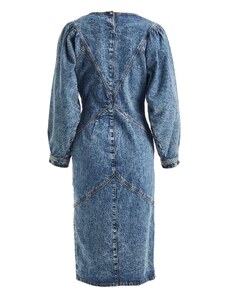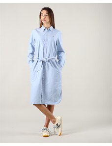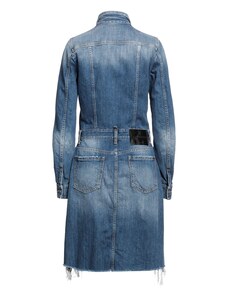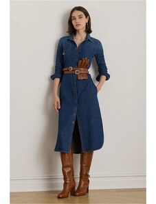 Abito lungo in denim con cintura fusciacca nello stesso tessuto completamente rimovibile, chiusura laterale con zip nascosta, profondo scollo a v frontale con sormonto, colletto a camicia, manica lunga chiusa con polso e bottoni logati a vista, taglio in vita, carre' posteriore, motivo di impunture a contrasto colore, tasche laterali in cucitura, lunghezza midi.