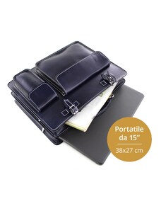 Cartella scuola/ufficio in vera pelle CHIAROSCURO mod. ALEX XXL, colore BLU, con tracolla, Made in Italy adatto a computer Pc portatile 15 pollici, brochure grandi, cartelle