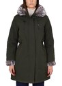 Giacca donna dal colore verde , realizzata in tessuto tecnico robusto con cappuccio e polsini in pelliccia sintetica animalier, nei toni del grigio e beige per un effetto caldo e moderno. Presenta chiusura frontale con zip coperta da bottoni automatici, coulisse interna regolabile in vita e tasche laterali a filo.