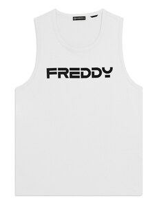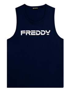 Canotta in jersey 100% cotone, dal look minimal e trasversale. Vestibilità regular, fondo dritto, scollo girocollo e spalline larghe con retro a vogatore per libertà di movimento. Il design pulito è valorizzato da una stampa opaca effetto gommato del logo FREDDY, centrata sul petto. Un must per l’estate o per i tuoi momenti di relax attivo.