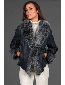Giacca in pelliccia di lapin nappato nero con collo in volpe brinata D'Arienzo