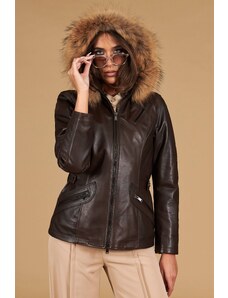 Parka in pelle testa di moro con cappuccio in pelliccia effetto liscio D'Arienzo
