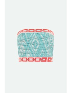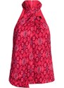 Top halter in viscosa e lino stampato a fantasia. Chiusura con zip posteriore. Smanicato. Orlo asimmetrico sul davanti. Fodera interamente in georgette.