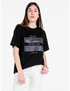 Solada T-shirt Girocollo Da Donna Con Stampa e Dettagli Strass Manica Corta Nero Taglia M/l