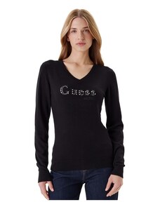 Guess maglia nera donna scollo v in misto viscosa logo con strass