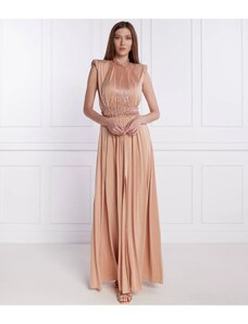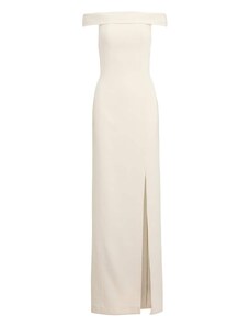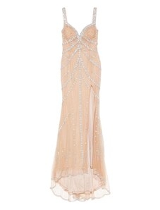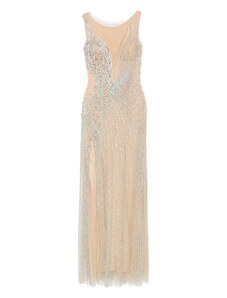 CHIC & HOLLAND Abito Lungo Beige Girocollo con Perline e Spacco Laterale